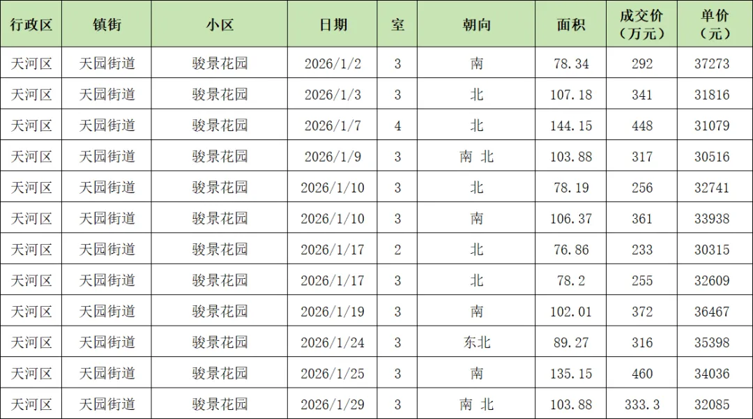 作为成熟社区的骏景花园成交12套,市场表现稳定,单价处于高位。小区内南向、南北通透的优质朝向房源成交占比超过一半,且单价优势明显,最高达37273元/㎡。成交主力为78-107㎡的中小户型,占比超七成。主流成交总价区间为255-372万元,体现了其区位价值。所有成交房源单价均在3万元/㎡以上,朝向对价格影响巨大,优质朝向北向均价高出非优质朝向约20%。