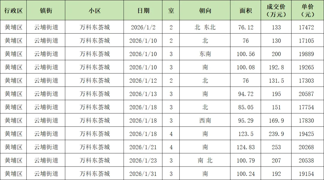 万科东荟城同样成交12套,市场表现多元化。南北向、南向房源最受青睐,是成交主力。刚改需求明显,90-120㎡的中等户型成交量最大,占比超六成。总价跨度大,从130万到253万元不等,但总价192-207万元是核心成交段。单价分化同样取决于朝向和面积,南向大户型(如124㎡)单价可超过2万元/㎡,而北向小户型单价则在1.7-1.8万元/㎡的区间。
