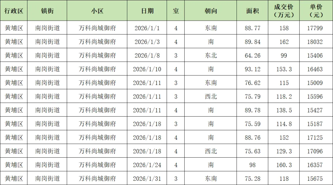 万科尚城御府的成交特征是高实用性和紧凑总价。75-90㎡的中小户型是绝对成交主力,占比近七成,适配刚需和首改。总价高度集中在115-162万元区间,占比达75%。在单价上,房源单价在1.5-1.8万元/㎡之间,南向房源单价普遍更高,其中南向房源成交最活跃。整体来看,这是一个以总价控制为核心,满足基本居住功能的活跃交易板块。