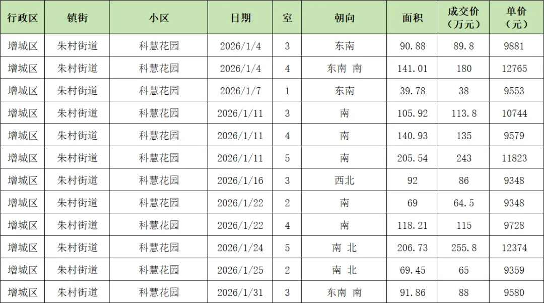 科慧花园市场跨度极大,满足了从单身到大家庭的多层次需求。南向房源成交占比高达一半,市场热度高。其最大的特点是户型面积与总价的覆盖范围极广,最小有39㎡、总价38万的房源,最大有206㎡、总价超255万的大户型。因此,单价区间也较宽,从9348元/㎡到12765元/㎡。60-120㎡的中等户型仍是市场主流,体现了其作为刚需、改善集中地的定位。