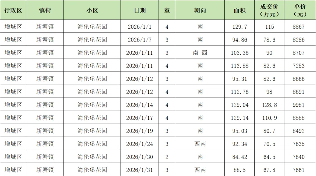 海伦堡花园成交活跃,市场特点鲜明。南向房源是交易的主力军,占比超60%,且单价多在8000元/㎡以上。成交面积段聚焦90-130㎡,占比高达75%,是典型的改善需求。成交总价分布呈现“橄榄型”,80-100万元的房源占据市场半壁江山,是绝对主流价位。房源单价区间在7253-9981元/㎡,南向大户型单价可达9981元/㎡的高位,朝向和面积的改善效应明显。