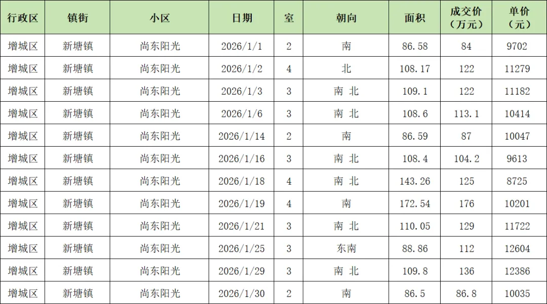 尚东阳光市场呈现“中小户型当家、大户型性价比凸显的特征。成交高度集中于86-110㎡的刚需/刚改户型,占比超八成。成交单价跨度大(8725-12604元/㎡),但价格表现反常理:东南向的88㎡户型单价可达12604元/㎡的最高点,而一套143㎡的南北向大户型单价仅8725元/㎡,是所有房源中最低的。这表明在该板块,大面积房源可能面临去化压力,溢价能力反而不如采光、楼层俱佳的中小户型。