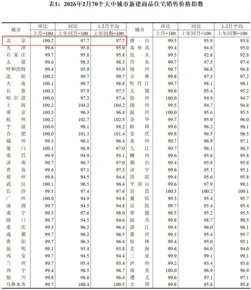 表1:2026年2月70个大中城市新建商品住宅销售价格指数