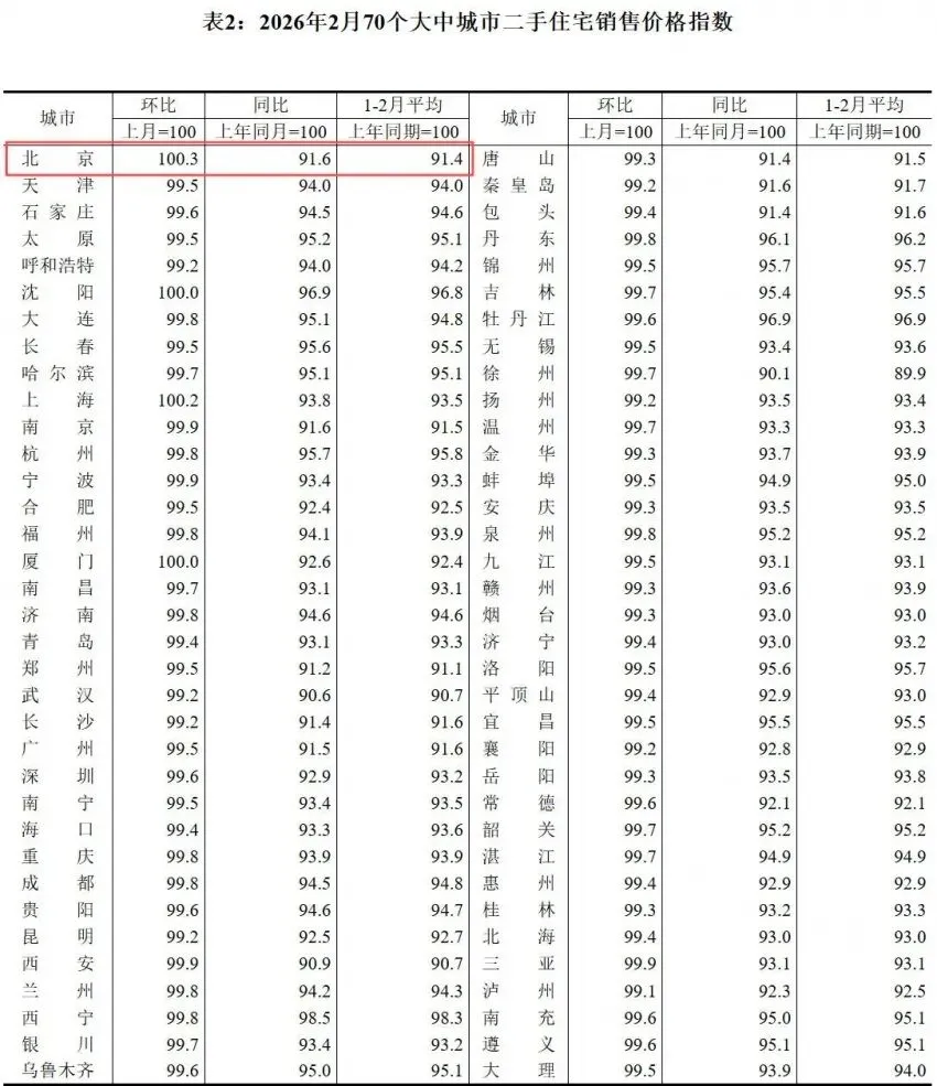 表2:2026年2月70个大中城市二手住宅销售价格指数