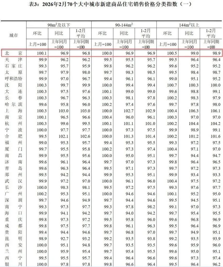 表3:2026年2月70个大中城市新建商品住宅销售价格分类指数