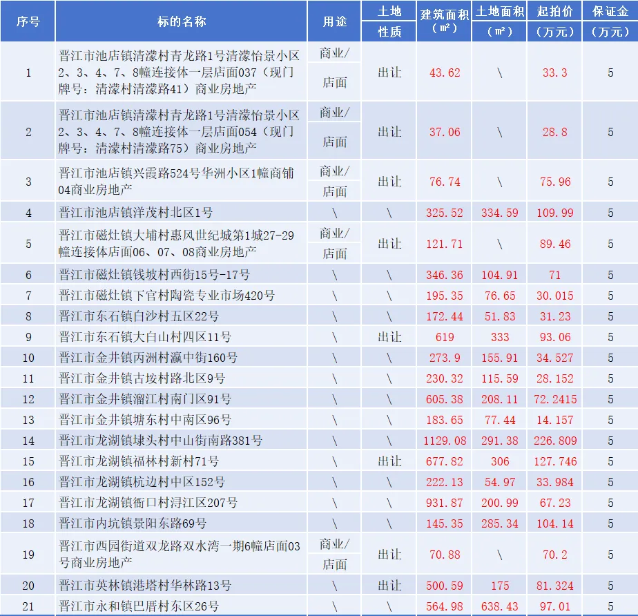 我行拟定于2026年3月30日(星期一)10时至2026年3月31日(星期二)10时(延时除外)在中拍平台(https://paimai.caa123.org.cn)公开拍卖:晋江市池店镇兴霞路524号华洲小区1幢商铺04等共计21处空置房地产,具体起拍价、保证金等详见清单如下:
