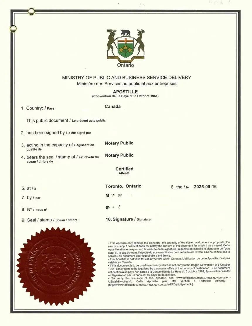 本案例中,居住在 加拿大多伦多 的华人当事人,通过在当地签署 放弃继承声明书,并由 安大略省政府完成 Apostille 海牙认证,仅用 1 天时间。完成后文件扫描件即时交付,原件快递至 北京亲属,确保亲属能及时向中国相关部门提交文件,用于办理 放弃继承与房产变更登记。