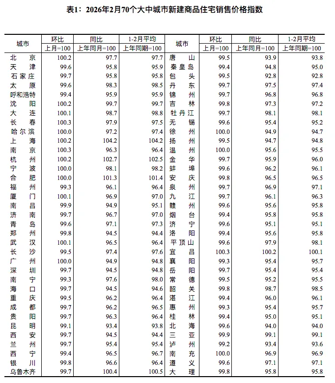 3月16日,国家统计局发布2月份70个大中城市商品住宅销售价格变动情况。