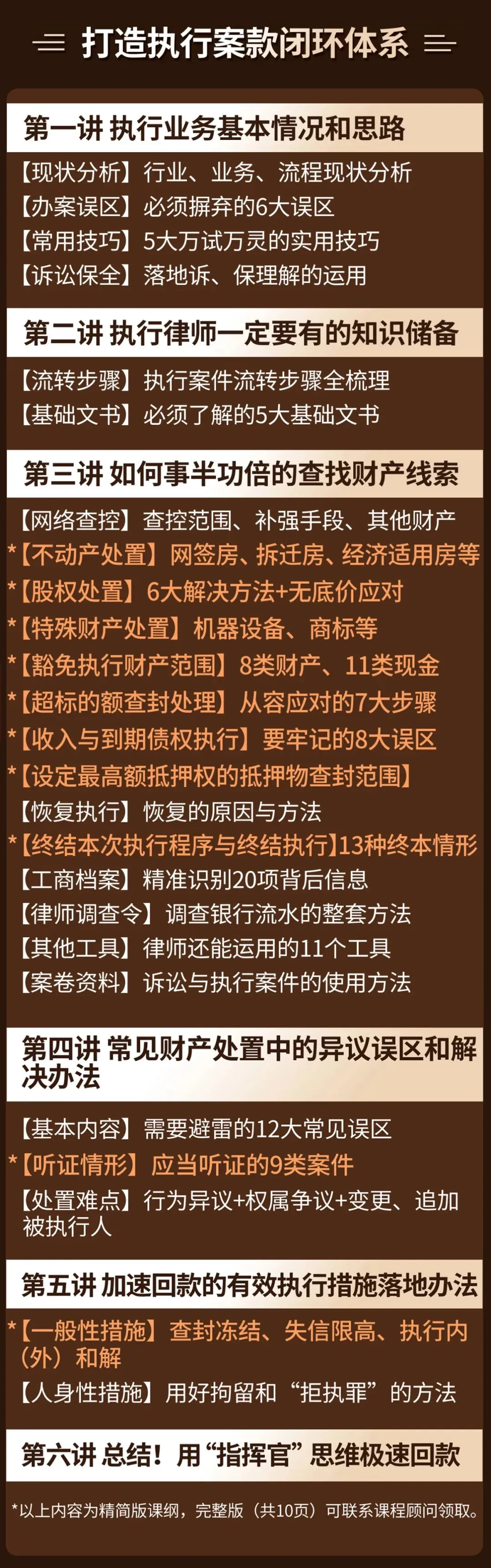 不贪多,把精力聚焦在执行业务的核心痛点上。怎么找到财产线索、怎么把财产执行变现,力求把最关键的部分讲清讲透。