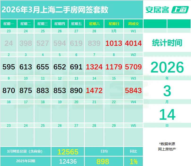 截至3月14日,上海3月二手房累计成交12565套。14天,破1.25万套,日均898套。同比首次回正。