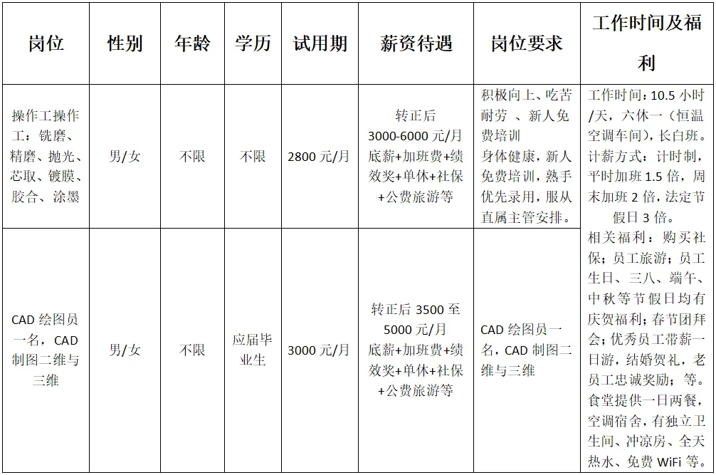 3、薪资待遇:3000-6000元/月,包吃包住,节日福利,月休3天