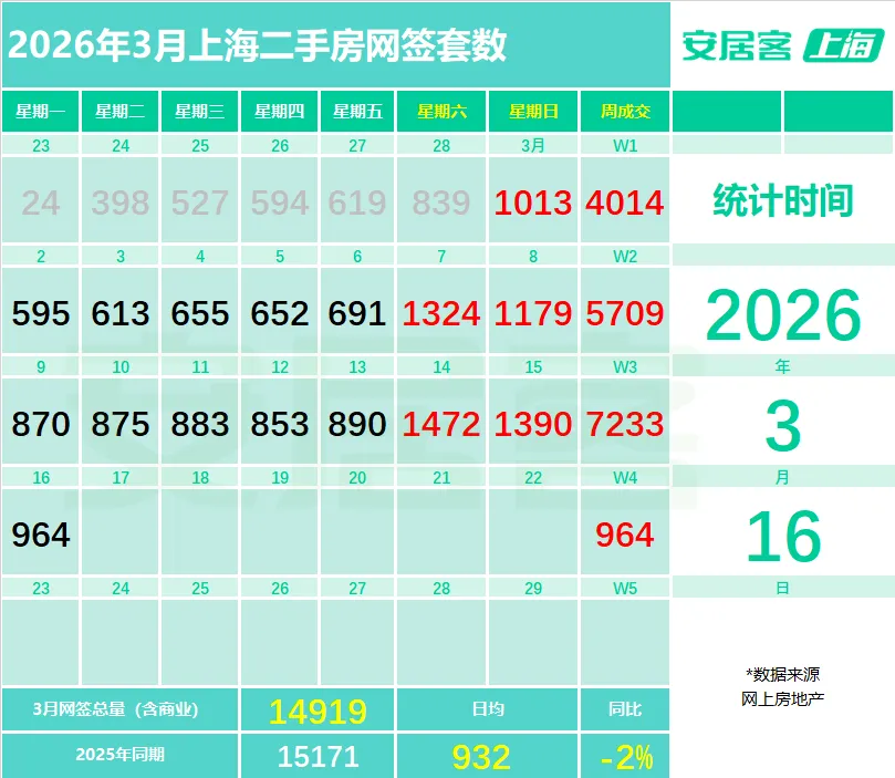 紧接着,3月16日周一,单日成交964套! 这是自2024年12月6日以来,时隔465天,上海二手房在工作日创下的最高成交纪录。