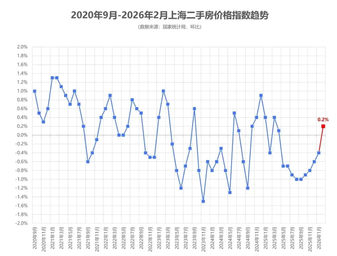 国家统计局最新发布的数据,给所有关注上海楼市的人喂了一颗定心丸。2026年2月,上海二手房价格环比上涨0.2%。