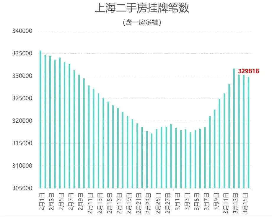 数据显示,3月16日上海二手房挂牌量为329818笔,较前一日继续减少373套,总挂牌量已经稳稳地回到了33万笔以下,连续三天出现回调。