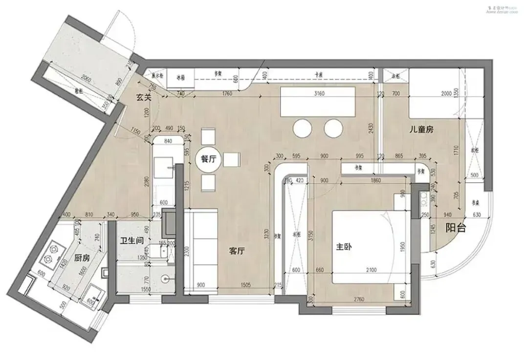 像这种带斜边的户型,别硬做一堆异形柜去“对抗”。你要顺着它,把斜角留成储物间或展示区,收口做干净,别让每个角都变成磕腿点。