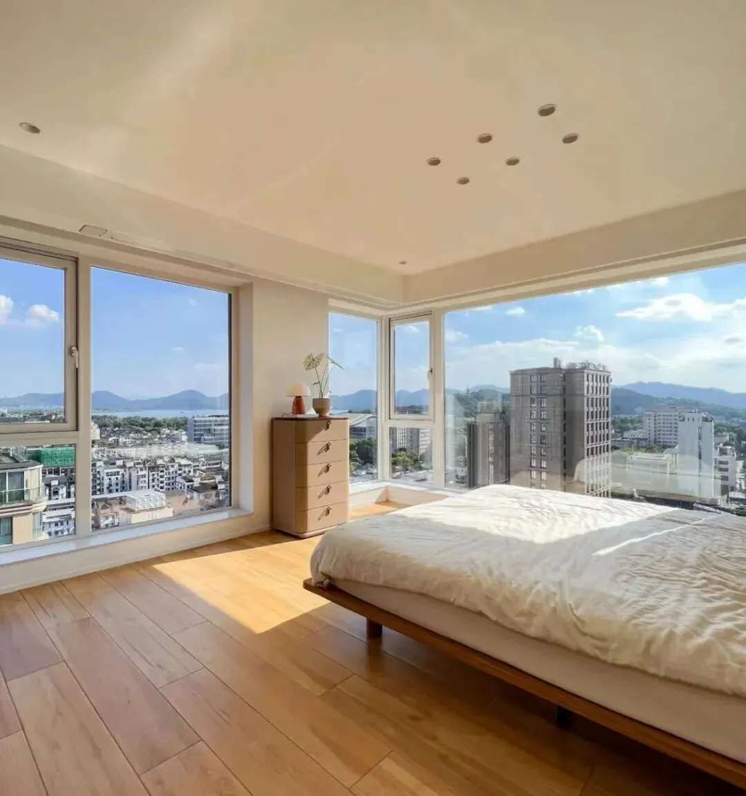 卧室这种大面窗,漂亮是真漂亮,但也别浪漫过头。床离窗太近,冬天冷辐射、夏天晒醒你。窗帘轨道要做顶装、遮光要足,玻璃能上中空就上中空,睡眠这事比背景墙重要一百倍。