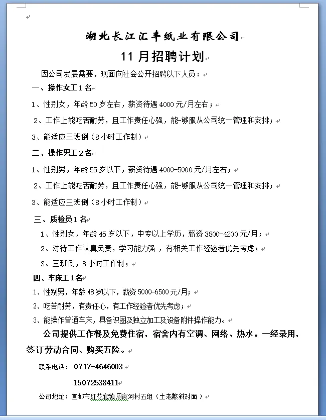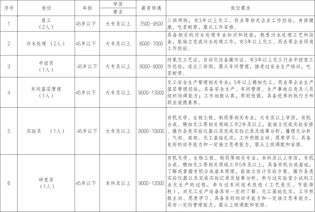 操作工岗位男工4名,三班倒,要求年龄40周岁以下。高中及以上学历,身体健康,能吃苦耐劳,有工作责任心。试用期1-3个月,综合工资约为4500—5000+元/月。