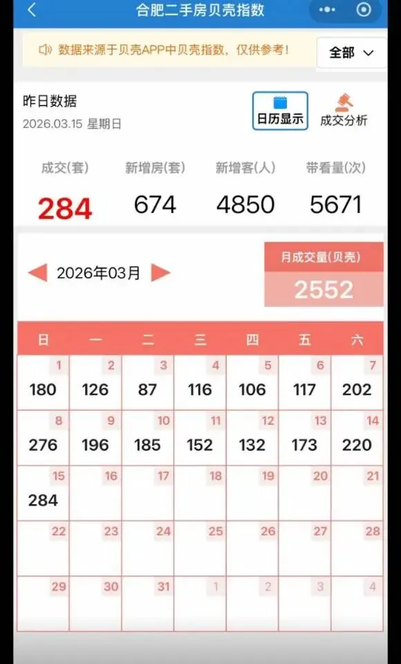 三月的合肥二手房市场,热度肉眼可见。贝壳指数显示,3月15日单日成交284套,截至当月中旬,月成交量已突破2552套,新增客源、带看量同步攀升,数据层面的回暖信号清晰,让不少人对市场走向产生分歧:这究竟是市场筑底的开端,还是短期情绪带动的小反弹?客观来看,当前回暖成色尚需验证,4、5月走势才是关键,且学区房仍是拉动成交的核心力量。