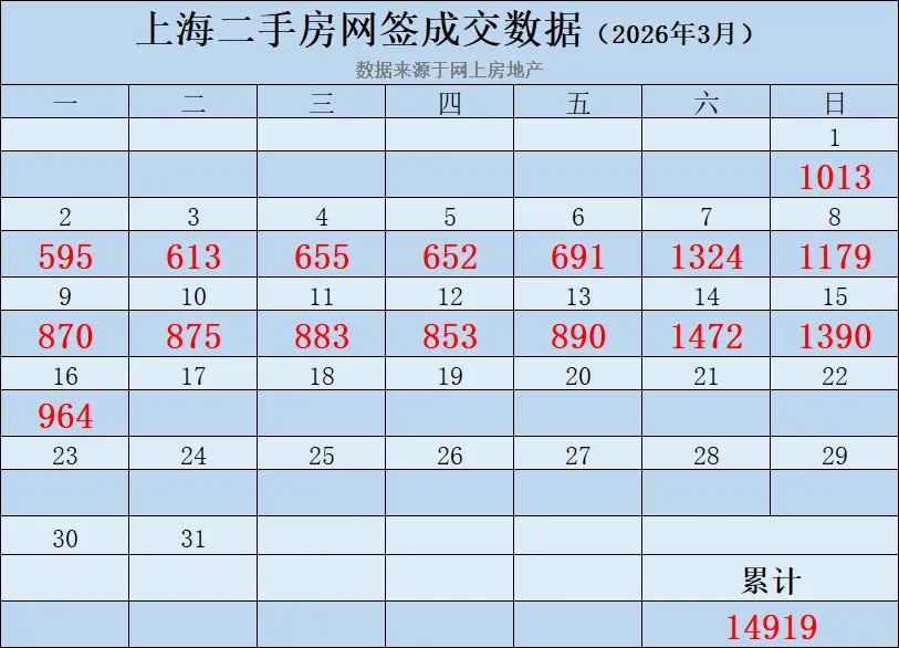 2026年3月上海二手房成交统计:(数据来源网上房地产)