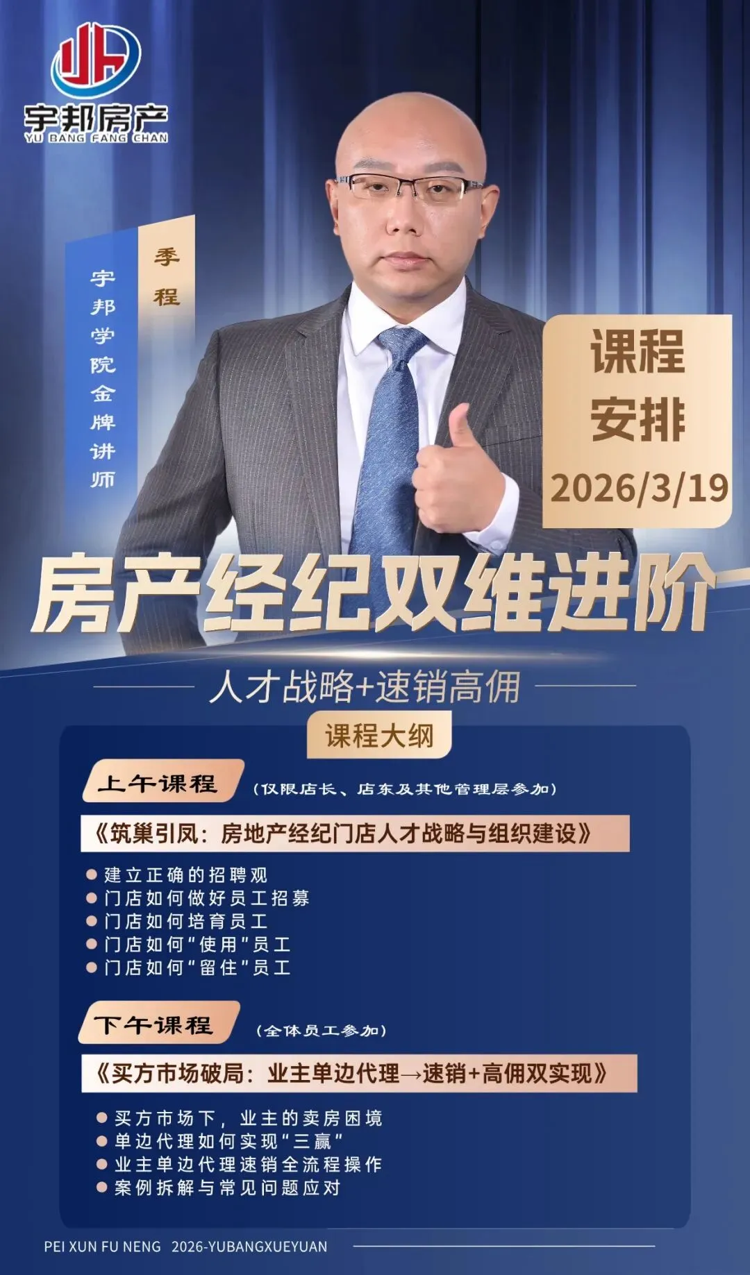 为了赋能全体家人,打造更具战斗力的精英团队,宇邦房产2026年第一期内部赋能培训重磅来袭!特邀金牌讲师季程坐镇,干货满满,助力大家从管理到业绩全面升级!