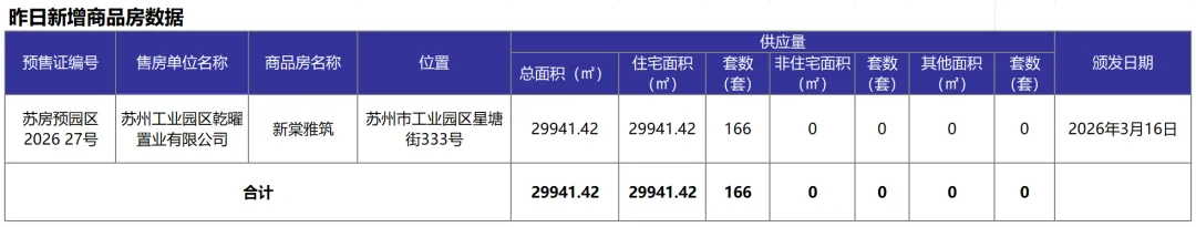 苏州3月16日住宅成交309套,新房住宅成交84套,二手房住宅成交225套,新房住宅新增166套,新房住宅可售41667套。