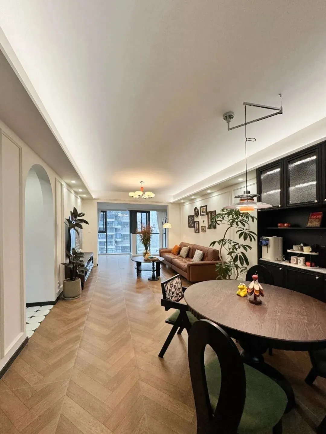 家具选材同样暗藏心机:涡旋腿小边几,这个细节本身就是法式符号的微缩版;丝绒软包餐椅,柔软的触感与布料肌理,在不动声色间把整个空间的温度拉高了几度。