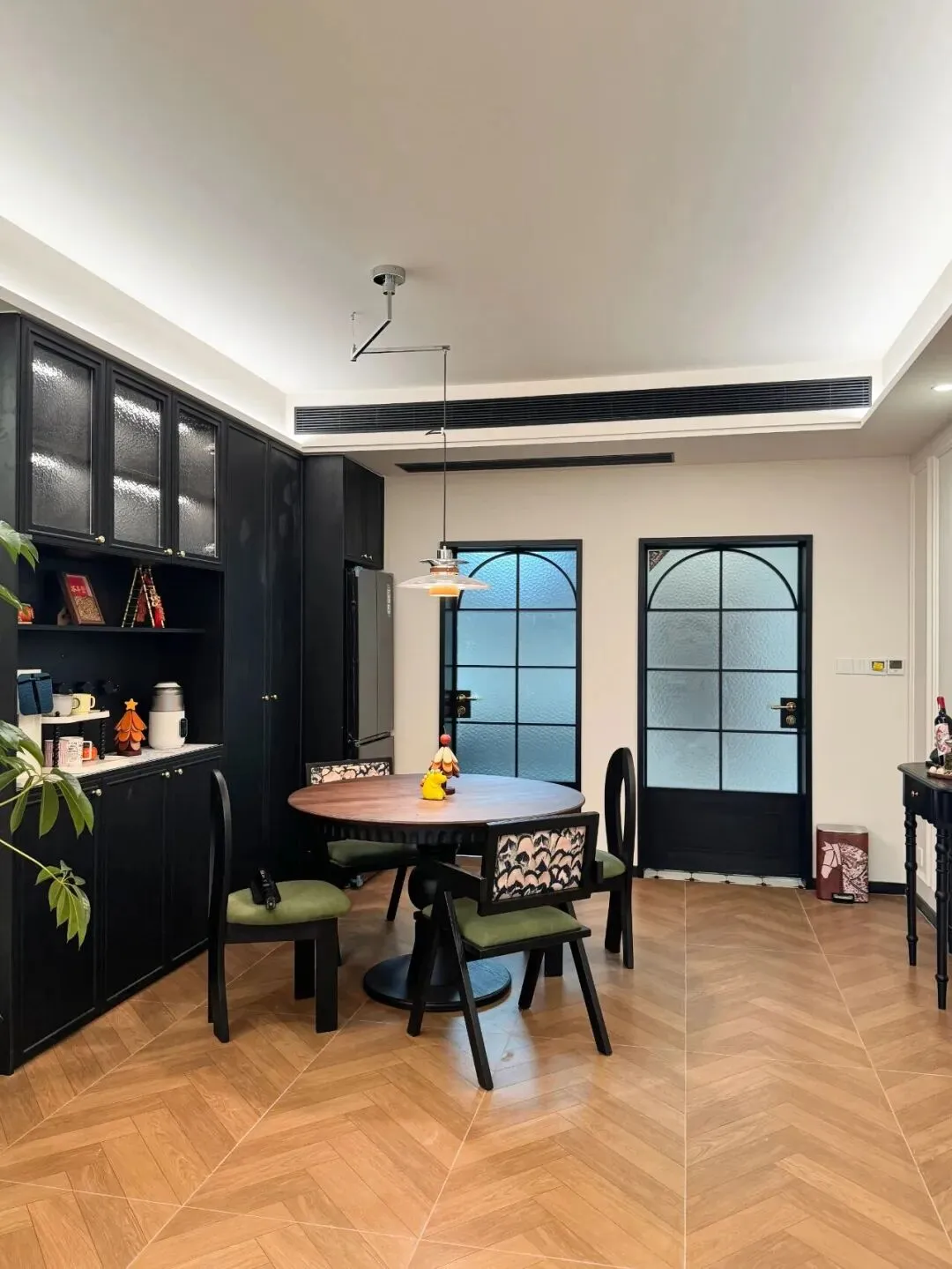地面定了温度,柜体就要做取舍。设计师彻底摒弃了厚重的雕花柜体——那种繁复感在法式简约的语境里,只会显得臃肿。取而代之的是利落的线条轮廓:哑光黑复古饰面,中和了木色的暖意;冷调金属五金点缀其间,打破了暖色系可能带来的沉闷,守住了法式空间独有的那种"轻盈的平衡感"。