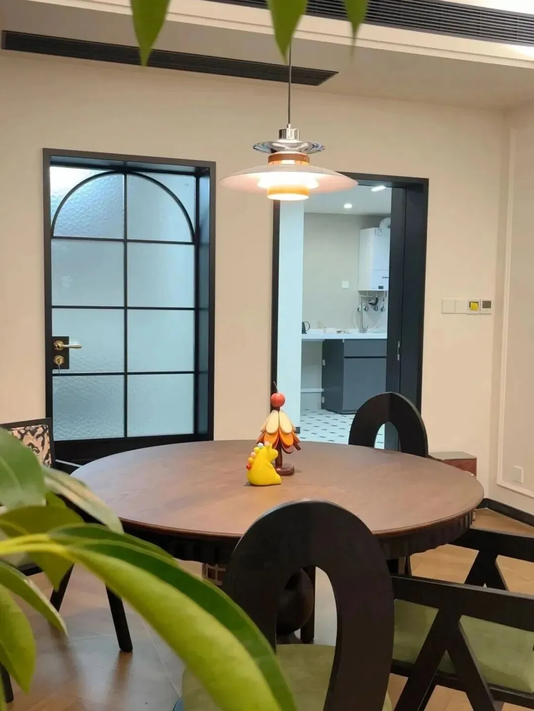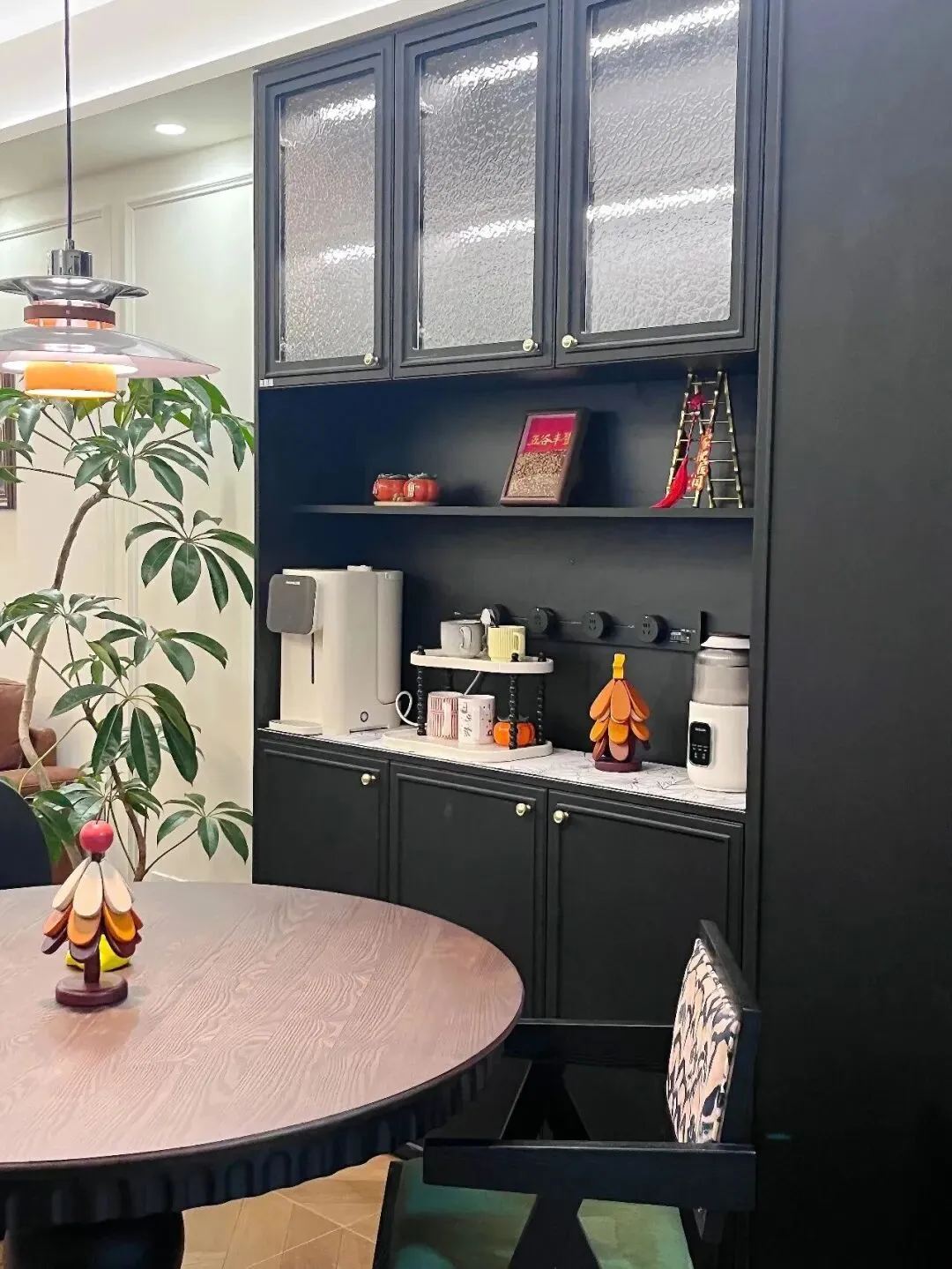 这套房子选用的是带弧形边缘的长虹玻璃门,而不是普通的直边款。这个细节极其关键:弧形边缘呼应了空间中其他软装元素的柔美线条,形成了视觉上的"隐性呼应"——不刻意,却处处照应。