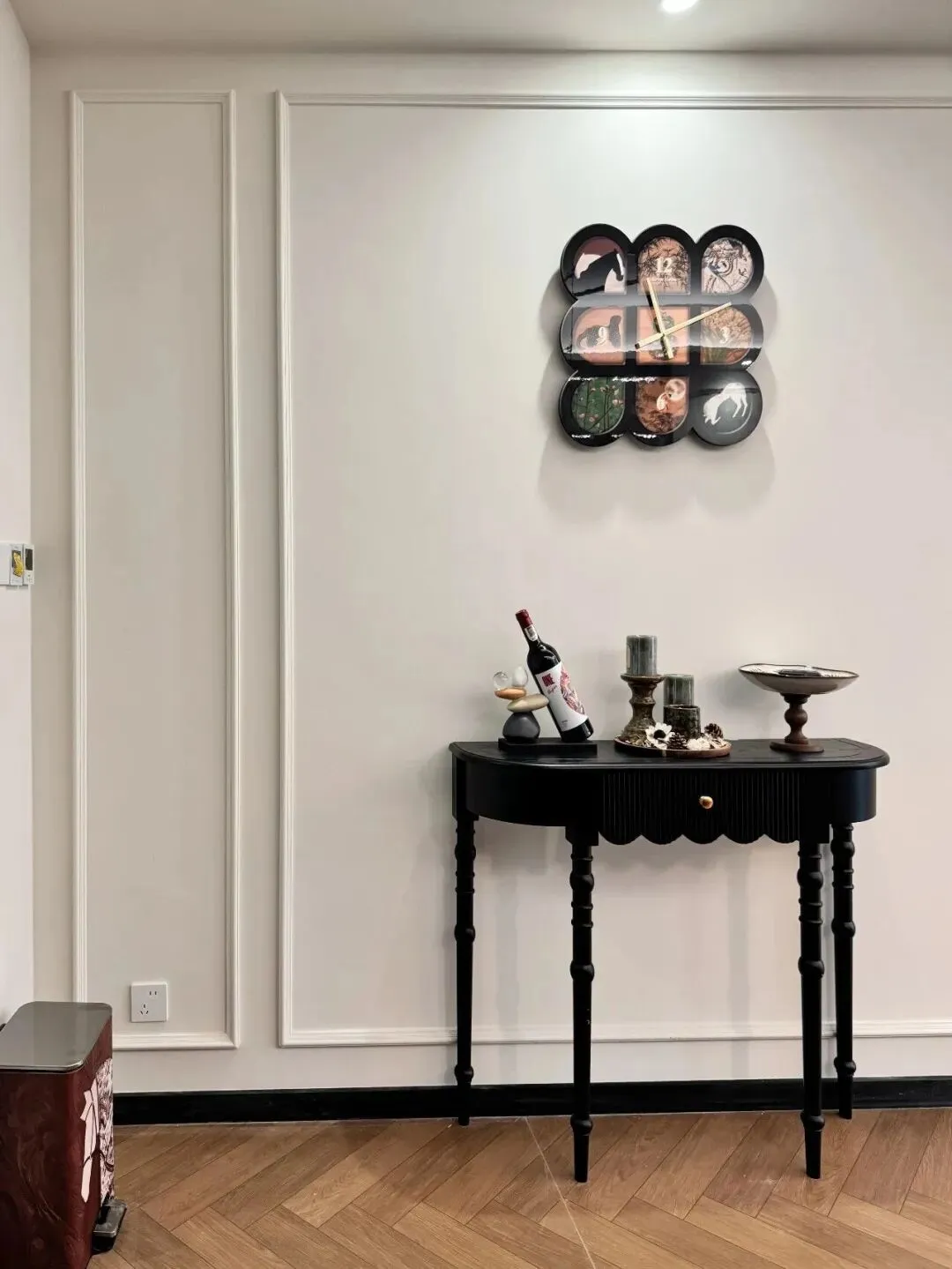 装饰画选用中古油画框组合,错落摆放而非整齐排列——那种轻微的随机感,晕染出一股文艺气质;画面里的静物肌理,与空间中的实体材质之间形成了一种"隐性对话",懂的人看了会会心一笑。