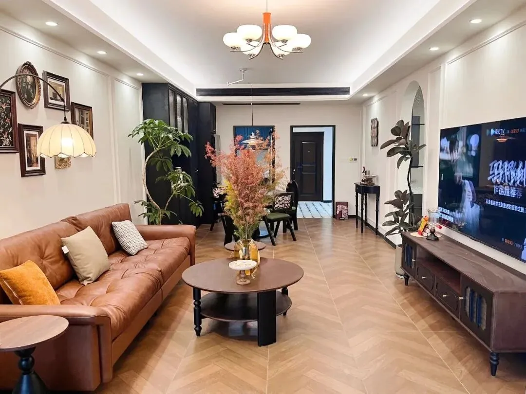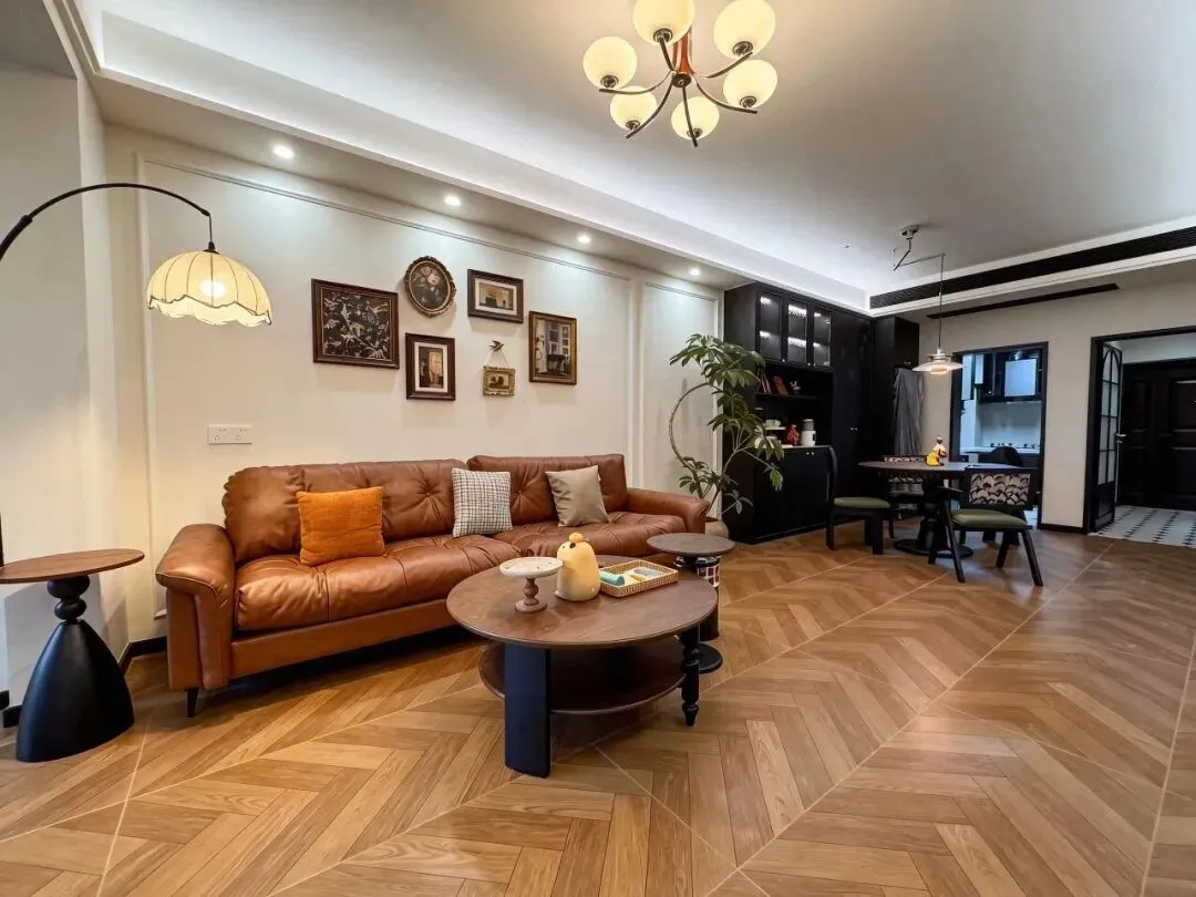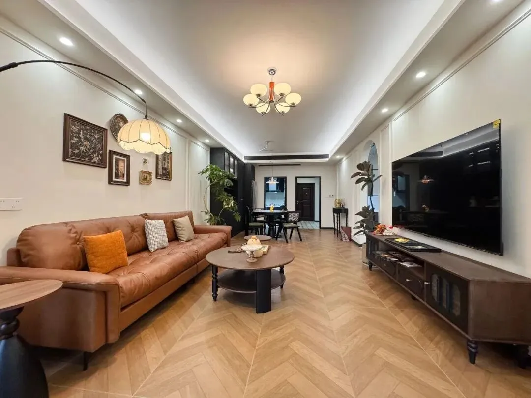 很多人装修时容易踩的第一个坑,就是地面选材。直铺地板固然稳妥,却少了一份层次感。这套房子选用了人字拼木地板——自然木纹搭配斜向拼接工艺,暖调定调,视觉上比普通直铺丰富得多,而且对户型的适应性极强,几乎"百搭"。