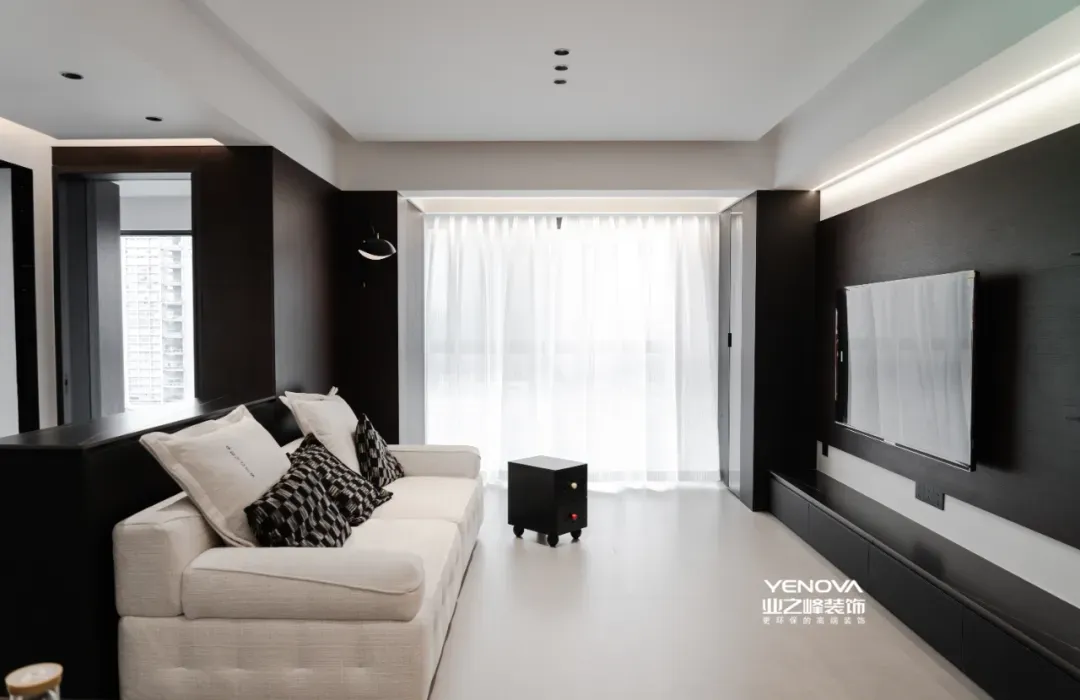 对称本身就是简约美学的精髓之一,它给人一种稳定、从容的视觉体验。而嵌入式灯带的加入,则彻底解决了回形吊顶容易显"压"的问题:灯带把吊顶的厚重感柔化开来,开灯之后,那种漫反射的氛围光将整个空间的气质提升了不止一个层次。