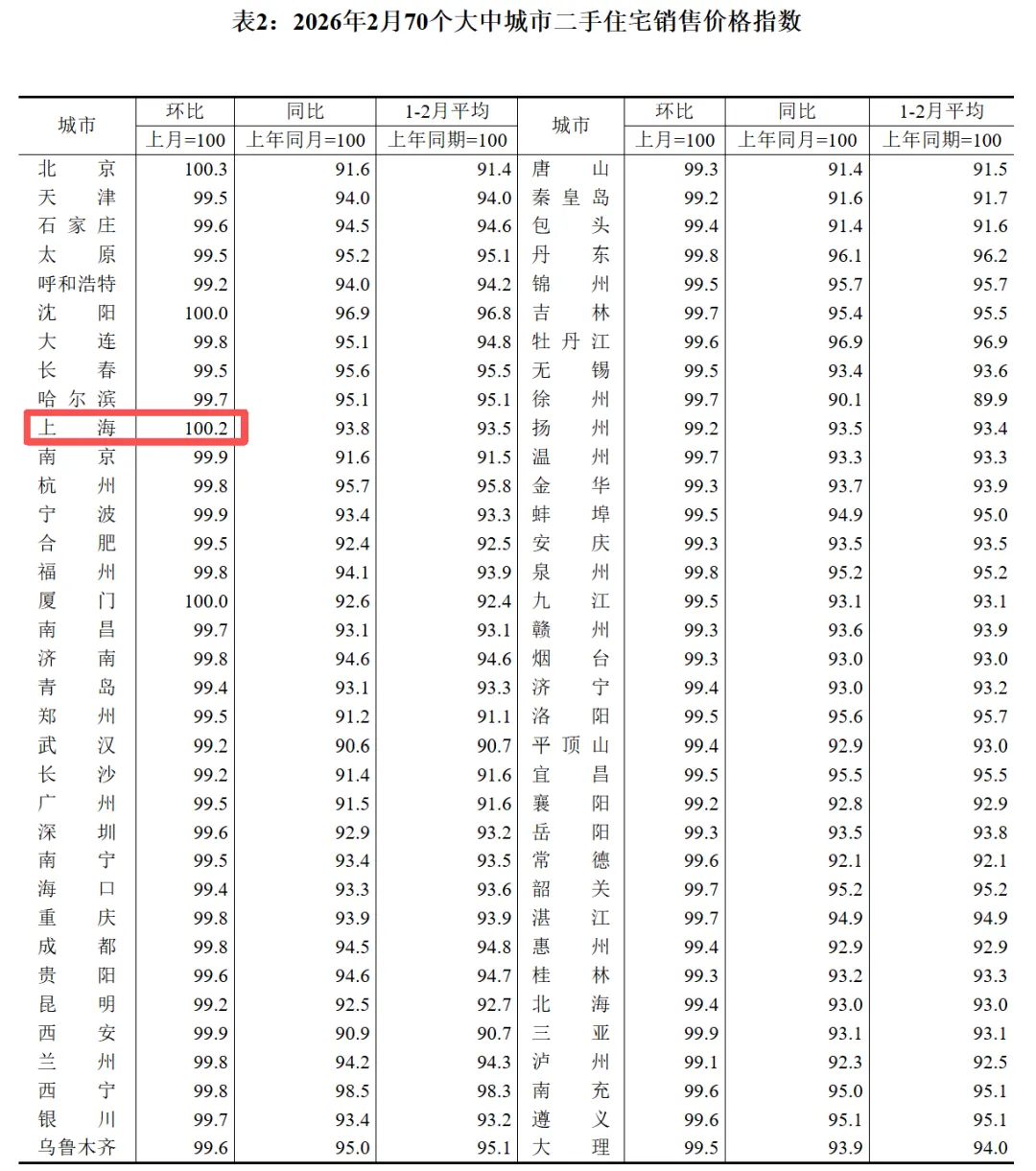 3月16日国家统计局公布全国70城房价数据:2026年2月上海二手房房价环比上涨0.2%。时隔9个月,上海二手房房价终于止跌回升。