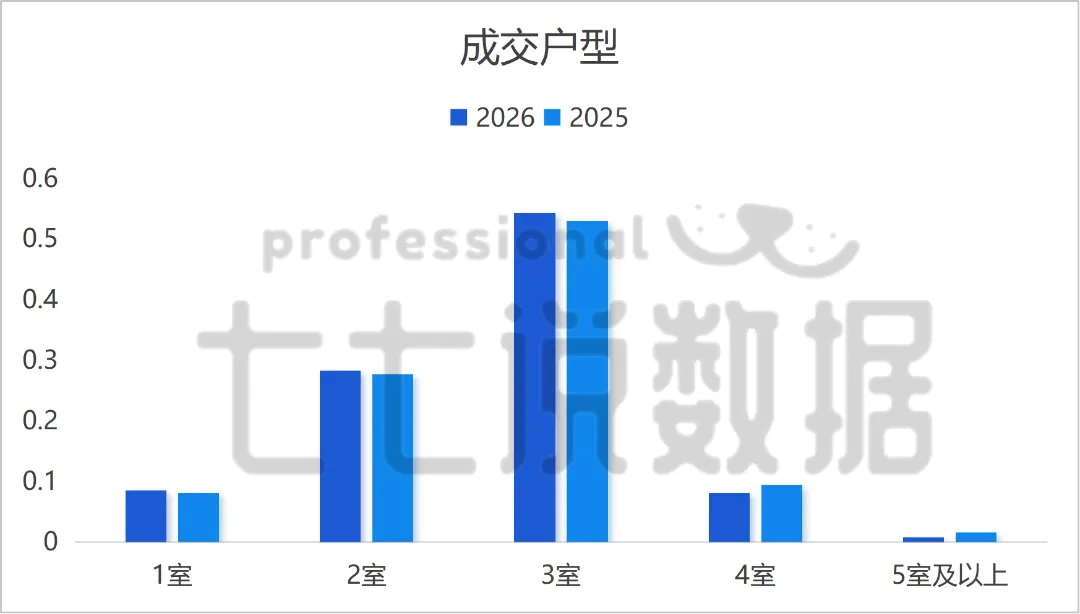✨ 2026年同期,3室户型占比高达54.25%👑,稳坐成交C位,无可替代,较2025年小幅增长2.46%📈;