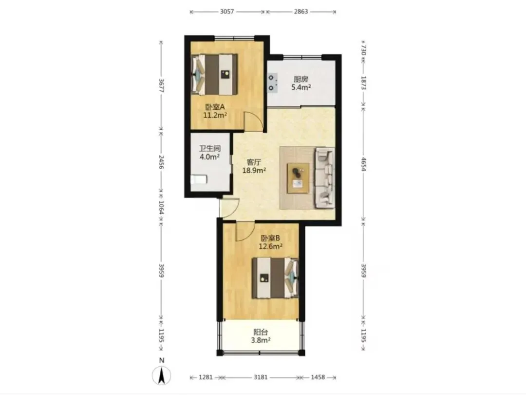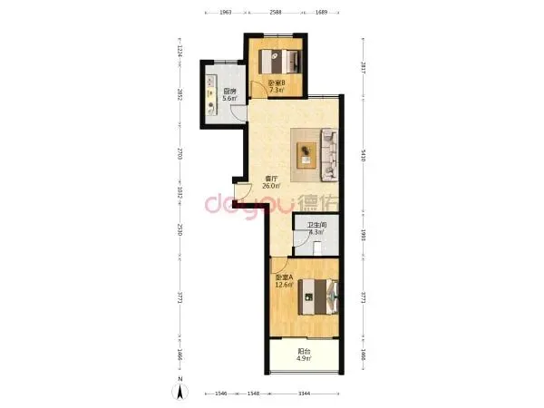 面积80.26㎡,2房1卫户型,219万