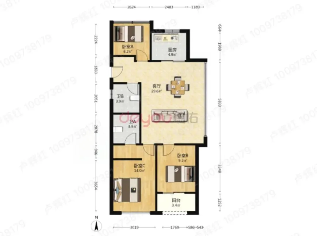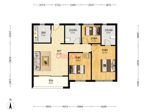 万科物业,面积88.64㎡,3房1卫