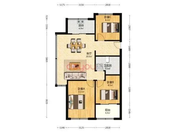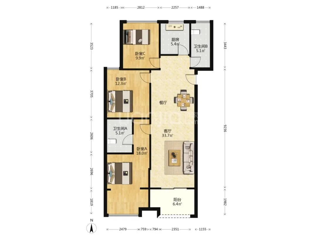 面积99.74㎡,3房2卫户型,340万钱学森教育集团八一校区