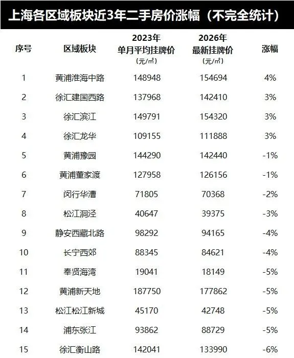 从2023年到2026年,上海16区大部分板块中的二手房价,都逃不过一个“跌”字,但偏偏也有例外,徐汇滨江、淮海中路等4大优质地段,挂牌价不跌反涨,让人大为意外。