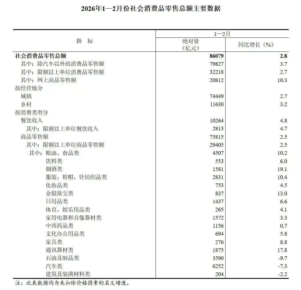 刚过完年,2026年1—2月的消费和楼市数据就新鲜出炉了。