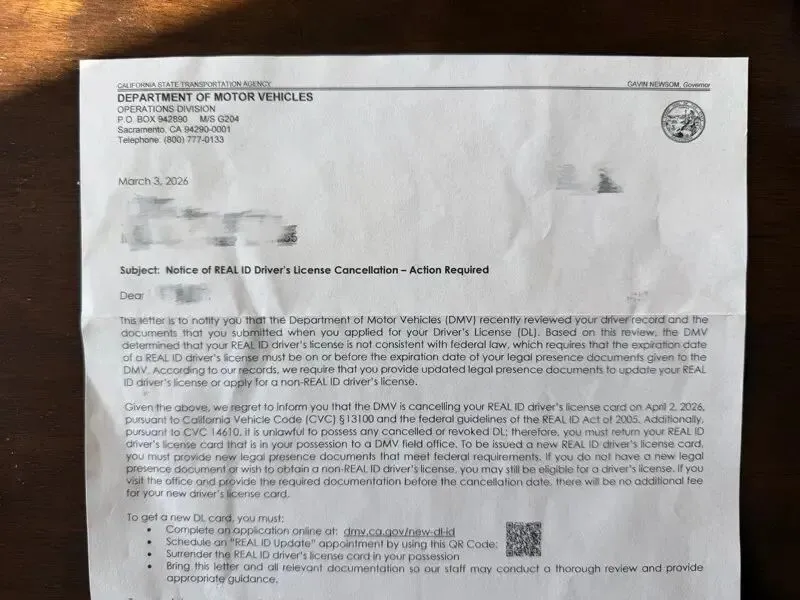 信中明确写道,她的REAL ID将在2026年4月2日被取消,必须重新提交身份材料重新申请。