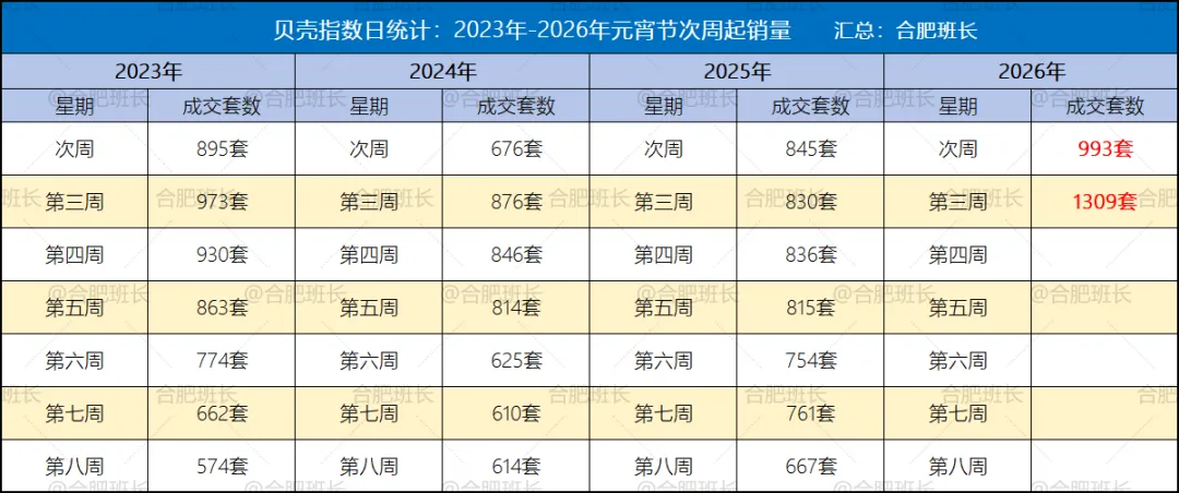 先简单看看2026年3月二手房数据,班长统计了2023年到2026年元宵节后次周起的贝系二手房成交量,今年的成交量表现格外优异,次周的993套、第三周的1309套都是遥遥领先。