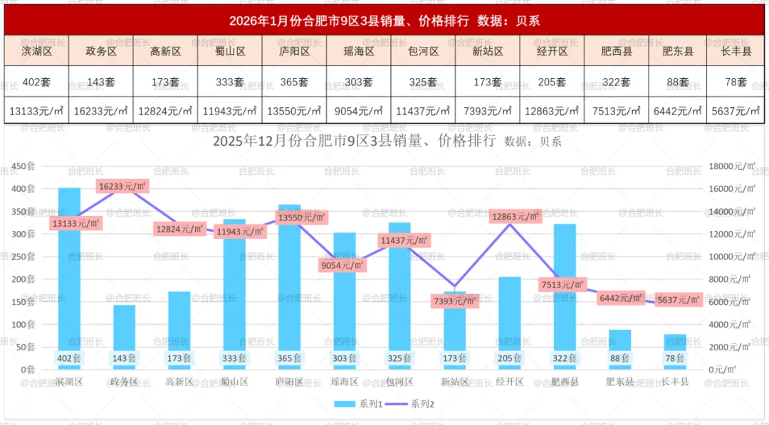26年1月份9区3县销量均出现上涨,最高涨幅达到58.89%,均价方面也有包括滨湖、蜀山、庐阳在内的8个区县上涨,最高涨幅12.91%。