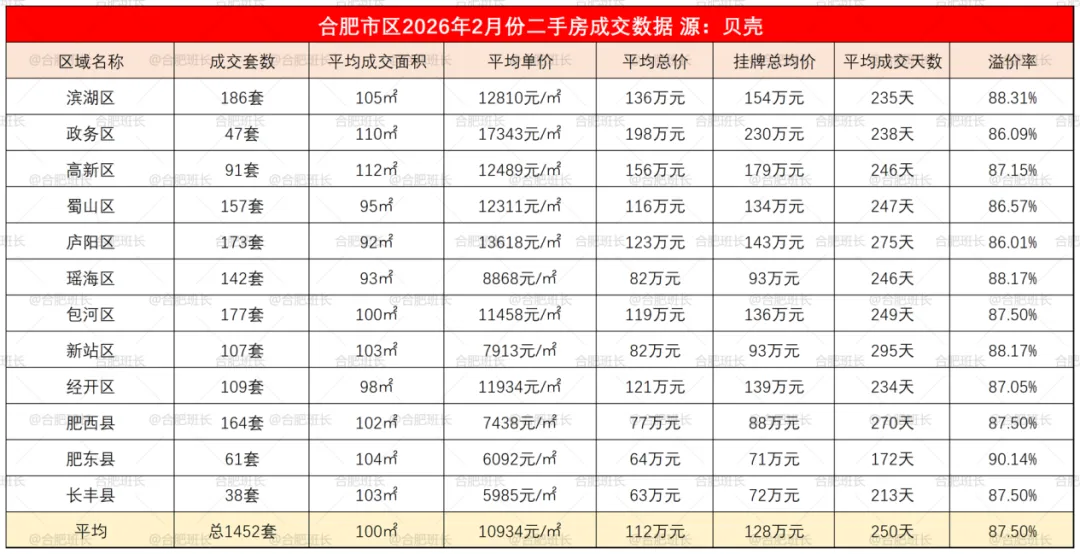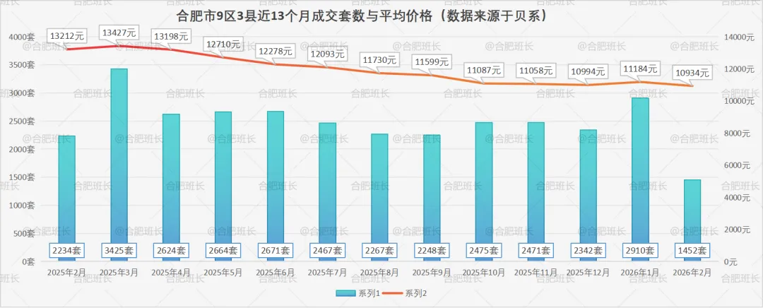 2026年2月份合肥九区三县共成交1452套二手房(筛选删除了车位、商铺、商业公寓和写字楼,下同);均价10934元/平米,成交面积14.5万方(1月为29.03万方)。