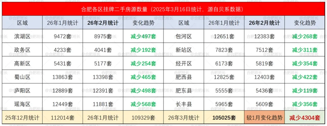 挂牌房源数据方面,2026年3月17日统计贝系前端挂牌二手房源105025套,较1月同期统计减少4304套,这也是合肥连续10个月挂牌量下降、连续8个月每月挂牌量下降超千套、3个月每月下降超2千套。