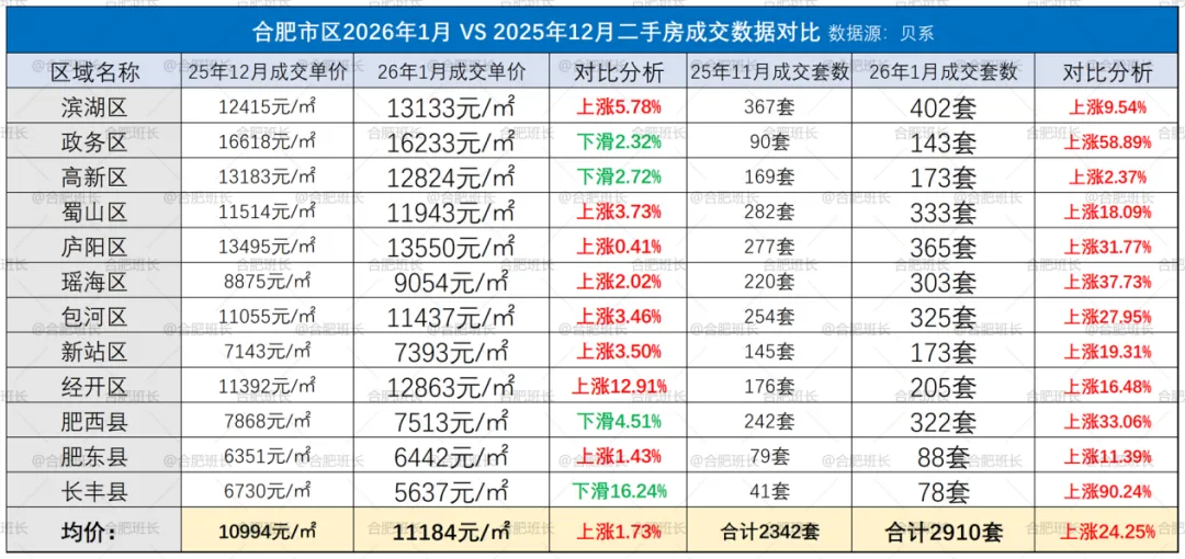 总体上看,2026年合肥二手房开年表现稳健向好,1月多区域量价齐升;2月受春节影响,小幅回落属正常波动。