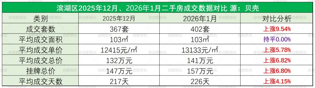滨湖区26年1月份共成交402套二手房,均价13133元/㎡,平均成交总价141万、面积103平米,成交套数和均价全面上涨。