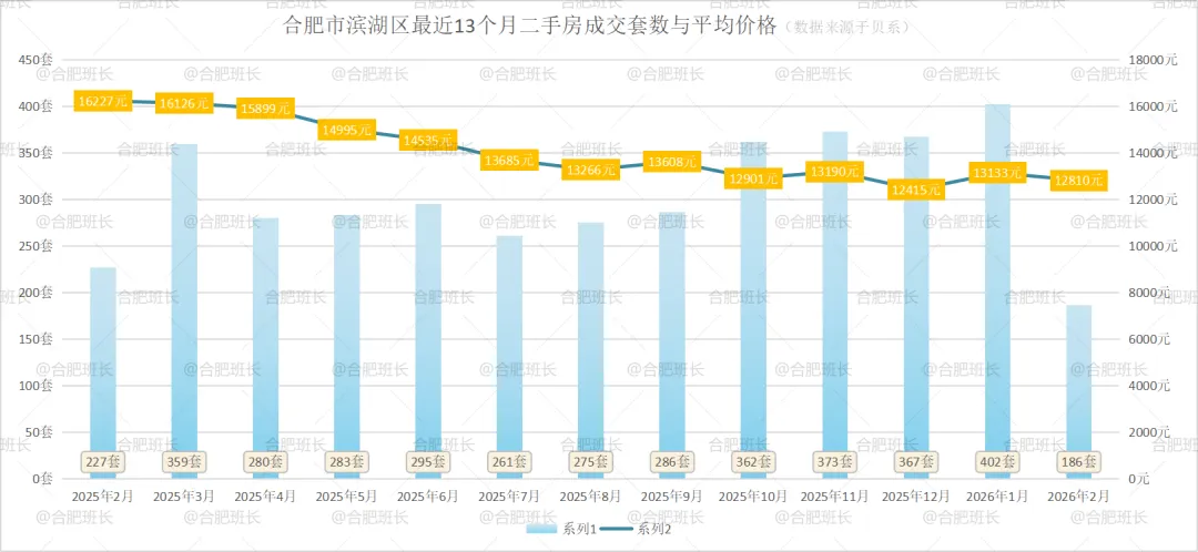 滨湖区26年2月份共成交186套二手房,均价12810元/㎡。