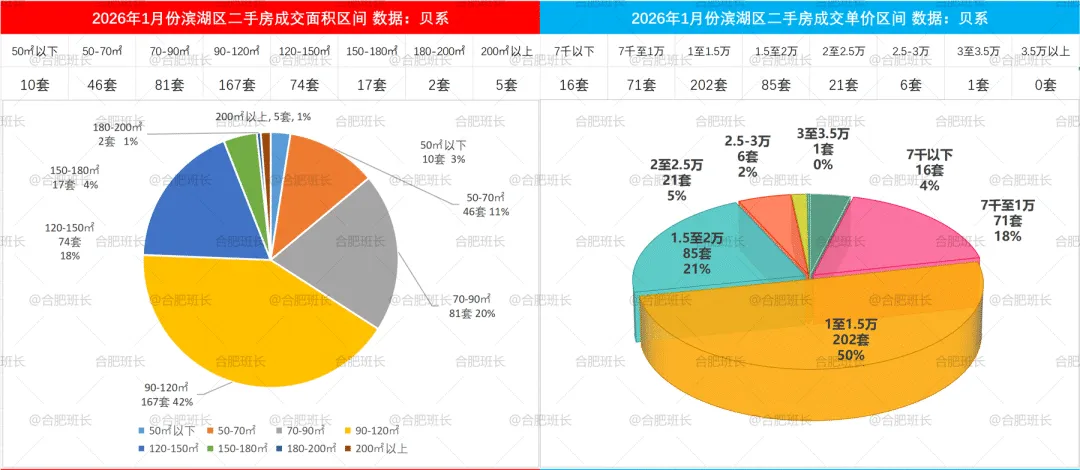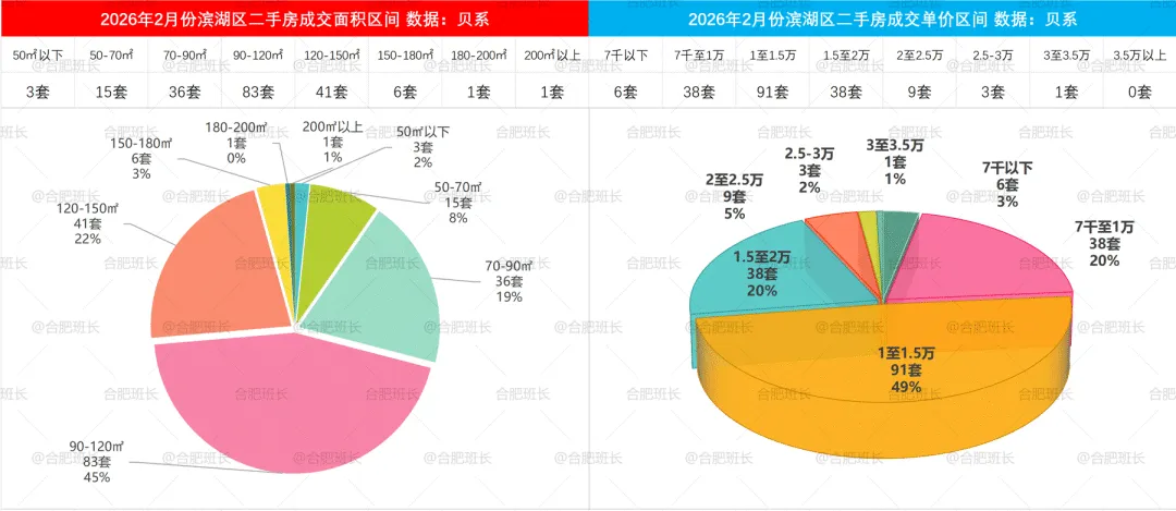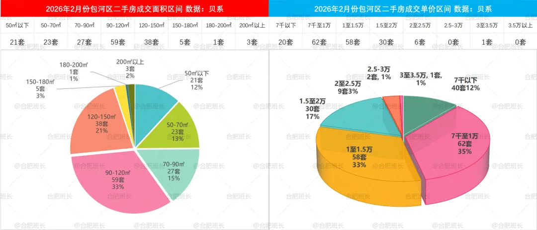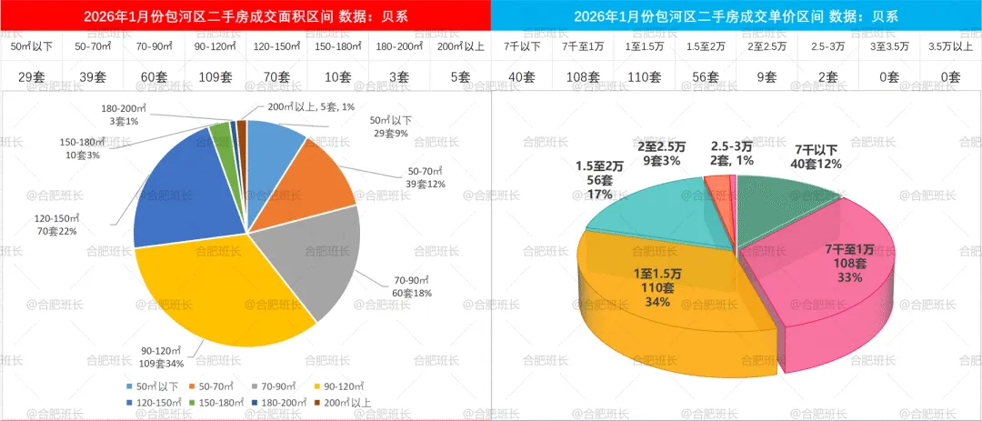 2026年1-2月二手房成交面积和单价区间,包河区50-70平、70-90平和120-150平分布较均匀,单价方面7千至1万、1至1.5万成交占比相当。