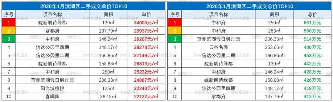 ▲26年1月滨湖区成交单价、总价TOP10