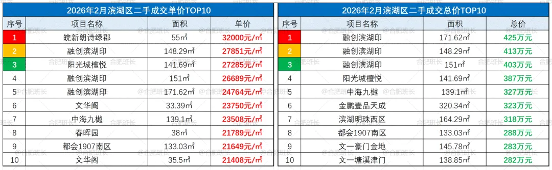 ▲26年2月滨湖区成交单价、总价TOP10