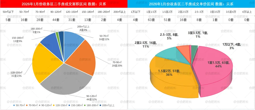 从2026年1-2月二手房成交面积和单价区间可以看出,90-120平稳稳占据成交主力、1至1.5万单价区间二手房最受欢迎。